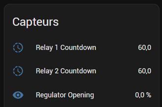 - Countdown for relay no. X For each relay, the current countdown is displayed. Initially the countdown is equal to the tempo bypass value, then with each energy regulation where the controller is at 100% the countdown is reduced, finally when the countdown is equal to zero the relay is activated.